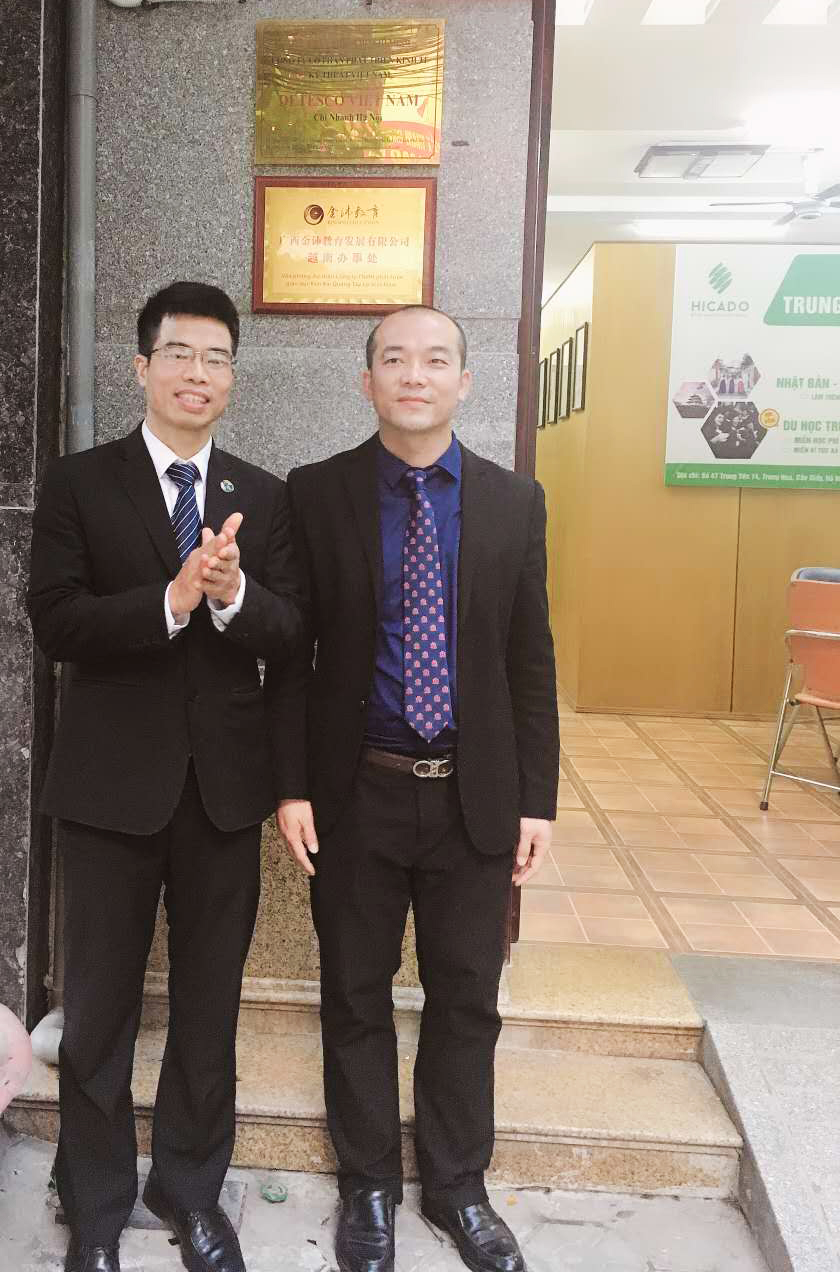 廣西金沛教育執(zhí)行董事粟宥朝(右一)與越南HICADO公司執(zhí)行董事阮功成(左一)共同揭牌