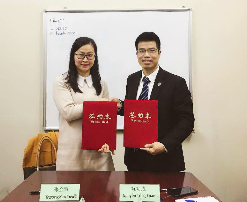 廣西金沛教育校長張金雪(左一)與越南HICADO公司執(zhí)行董事阮功成(右一)簽署協(xié)議