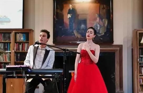 亞當(dāng)·戴維斯(左)與菲比·海恩斯(右)在倫敦的孔子學(xué)院活動上表演中文歌曲